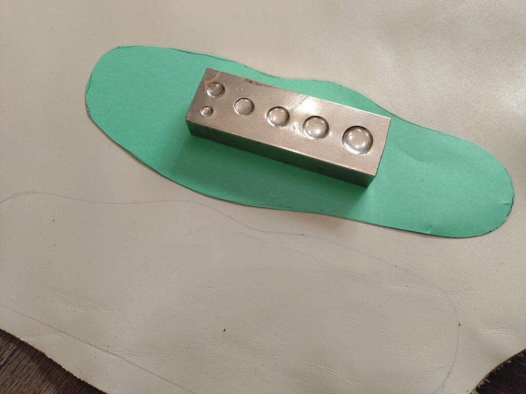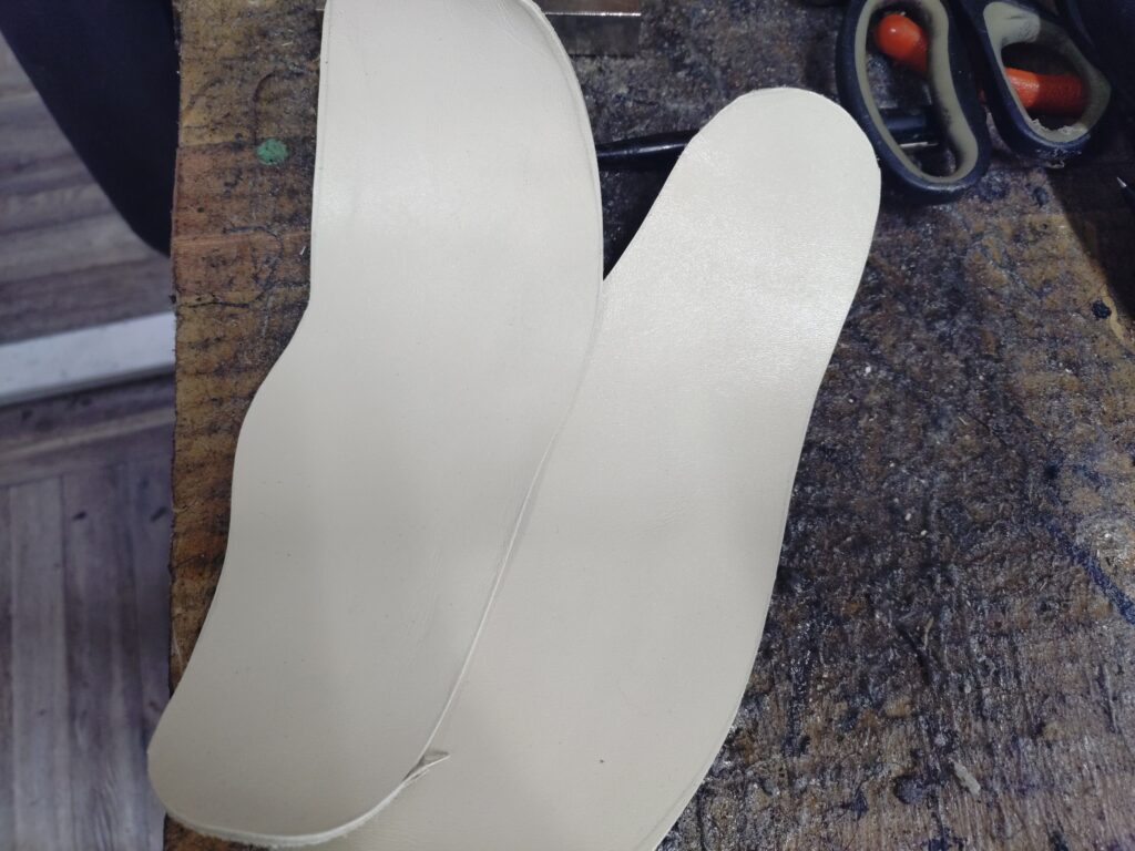 足の形に合うよう、型紙を作って一枚一枚カット。 - 革の中敷を仕上げ