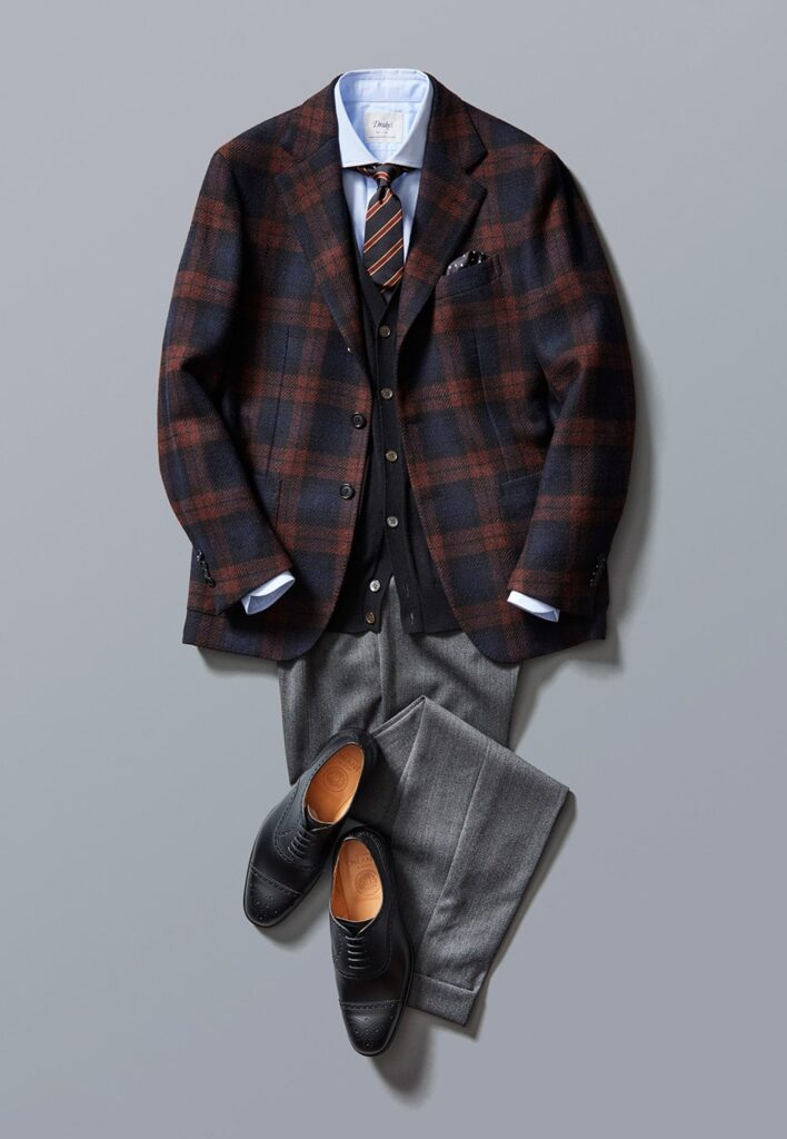 チェックジャケットやウールパンツなど、ジャケパンスタイルにも自然に溶け込むのがセミブローグの魅力。