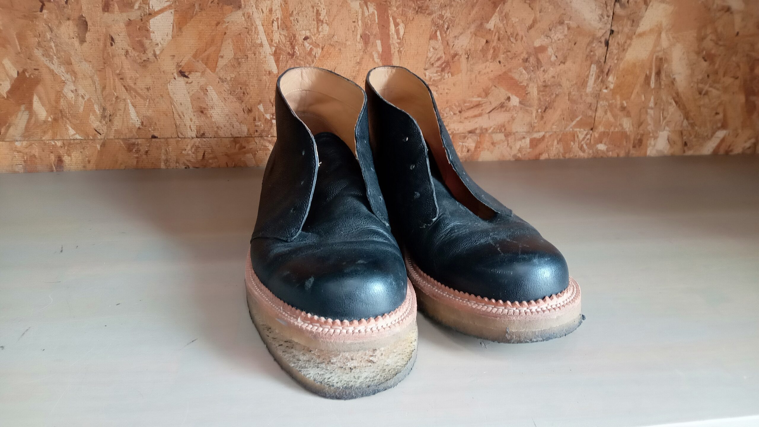 • オリジナルのクレープソールがボンドの経年劣化で硬化・・剥がれが進行。
