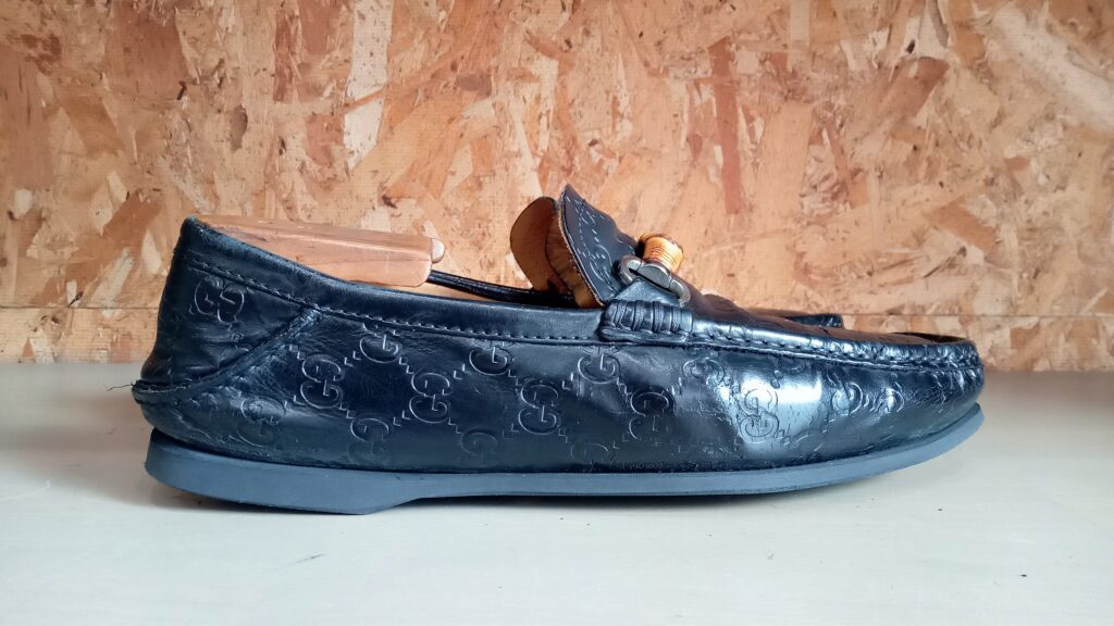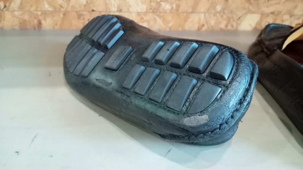 一番減りやすいカカトの外側から、ついた傾斜により、フマズの甲革までダメージが及んでます。中心部分のグッチのロゴはもったいないですが、ソールで隠してしまいます。