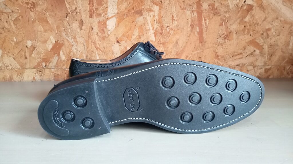 純正のSGソールから、雨の日でも安心なヴィブラム ダイナイトタイプソールへの交換、さらにかかと内側のスベリ革補強も行いました。