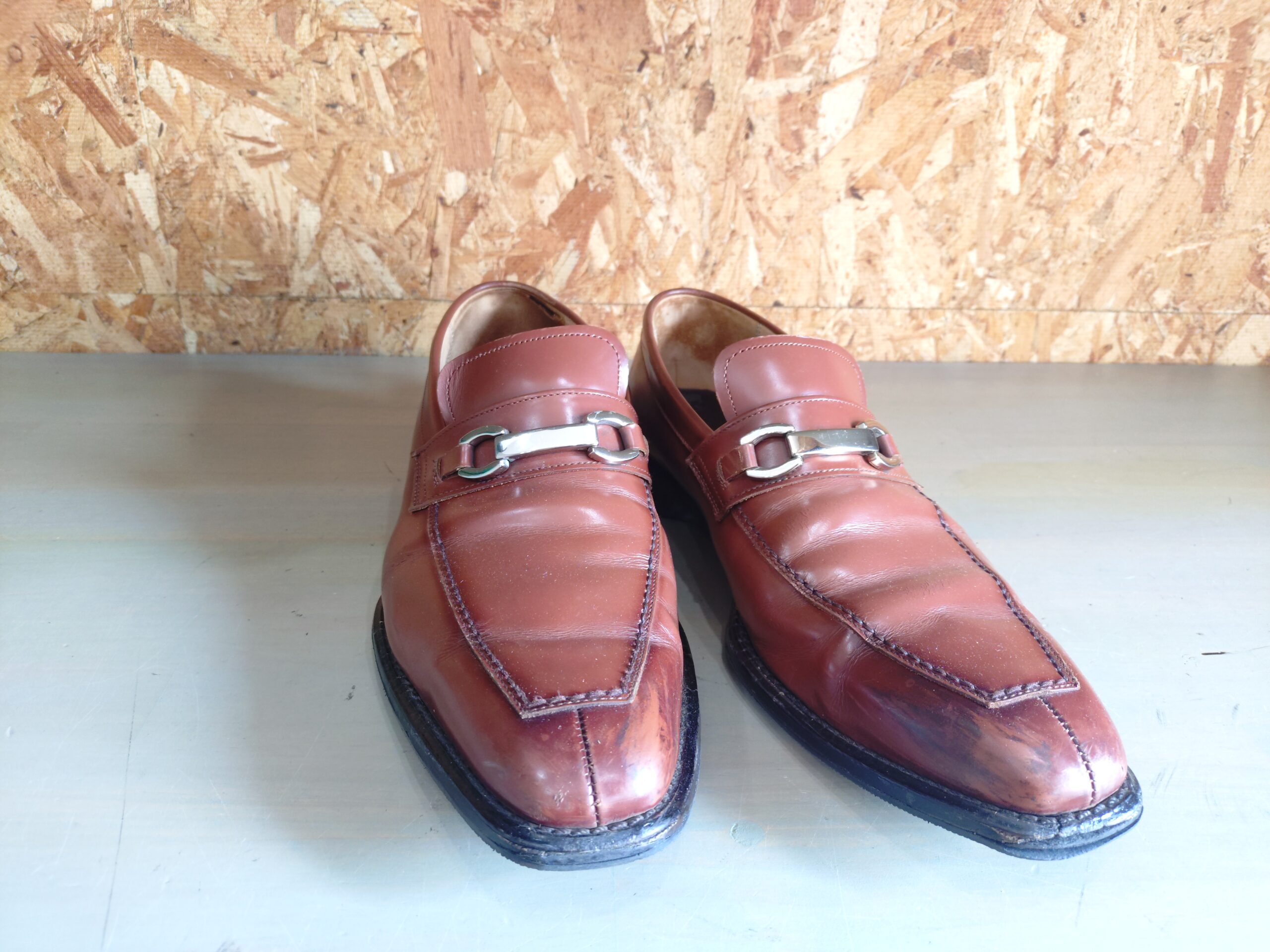 こちらのローファーはロングノーズといって、つま先が長く設計されており、自身の足長よりも靴が長いためこのようにつま先にダメージを受けやすいです。