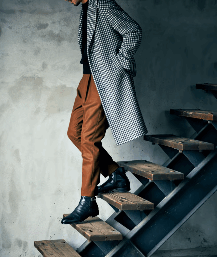 武骨さの中に上品さが漂い、カフェや街歩きに最適。 - ジャケパン+ジョッパーブーツ