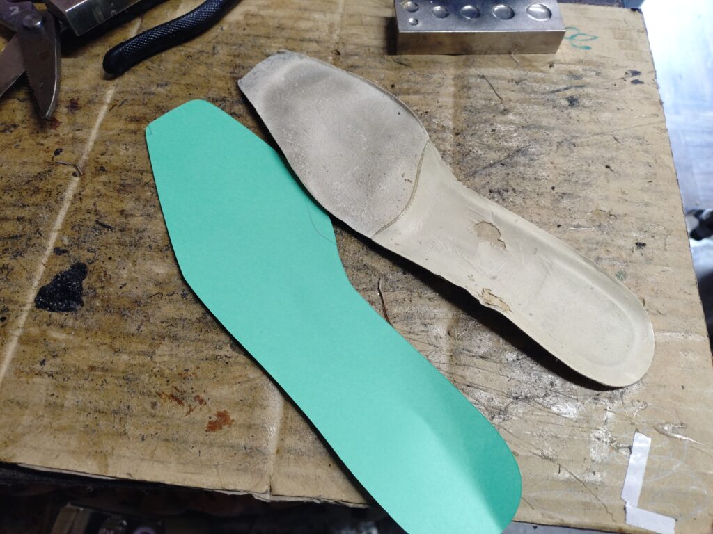長く愛用されている一足のようで、かかとのトップリフトが外れ、中敷きも劣化しておりました。