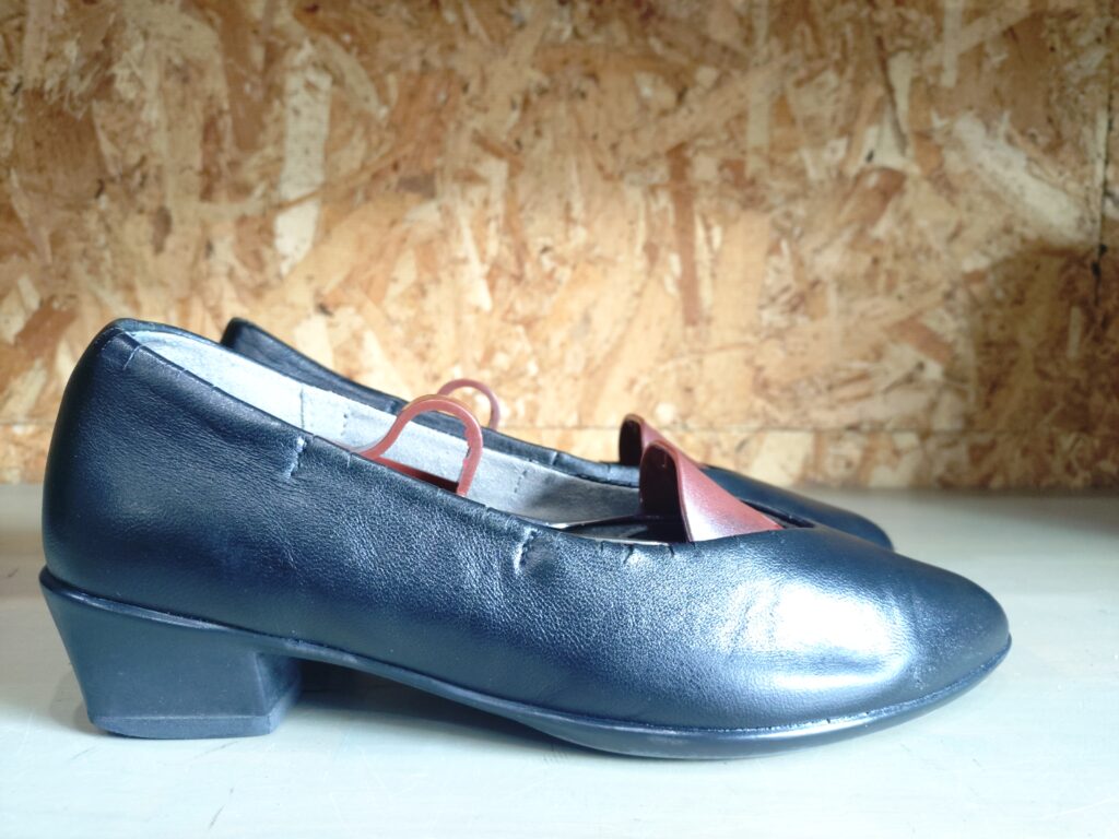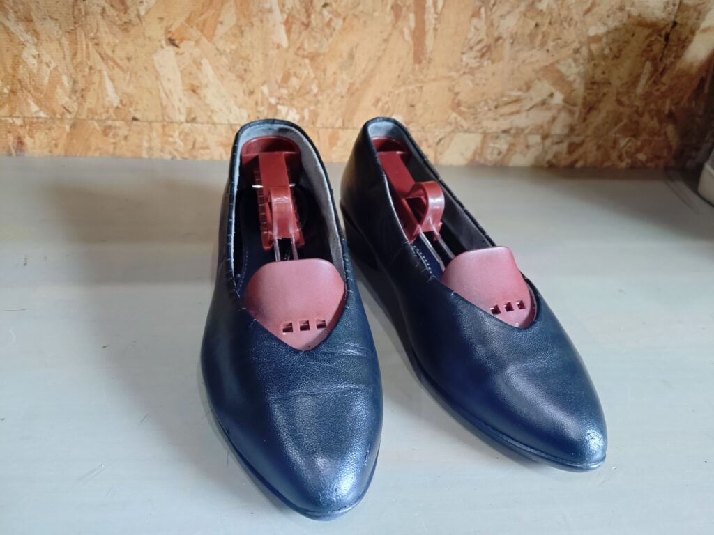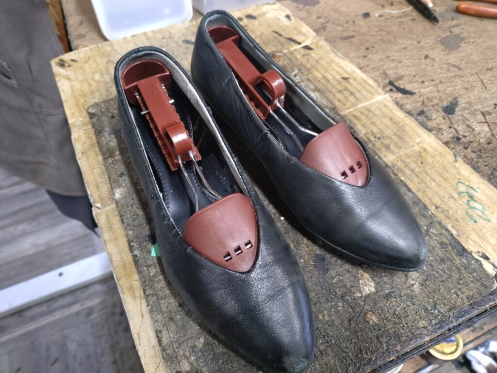 靴にシューキーパーを入れて履きジワをのばします。シューキーパーを入れることで型が整い、扱いやすくなります。