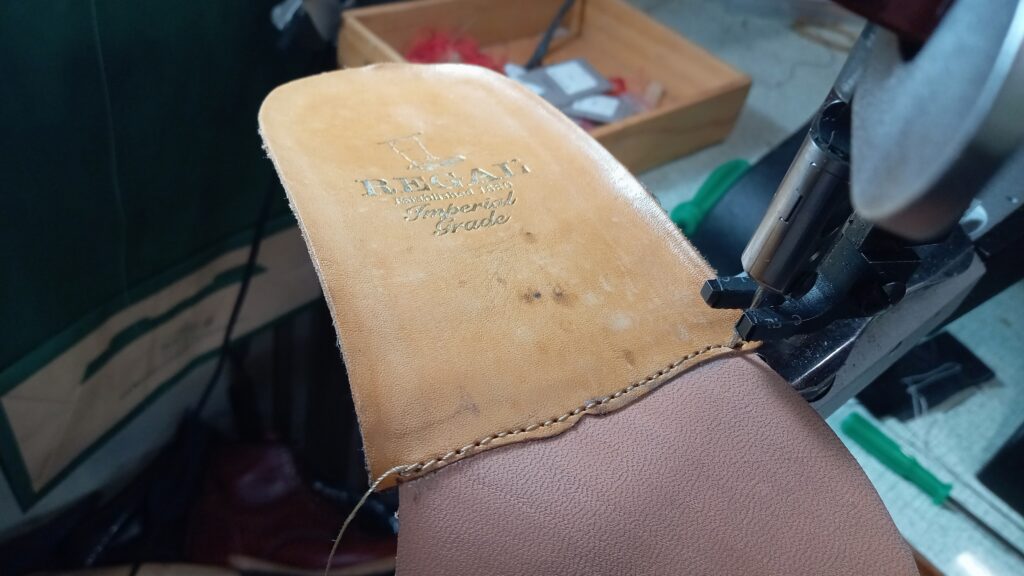 革が厚くミシンが通らない場所や、モカ縫いには手縫いで補修を行います。