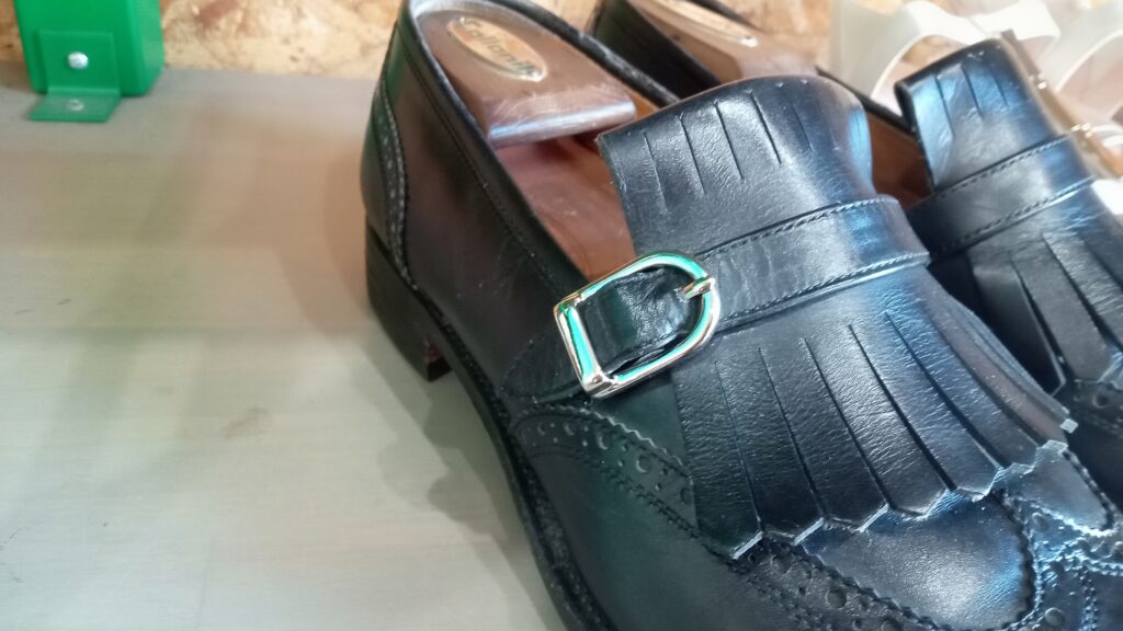 モンクシューズに使われる金属バックルが外れたり、曲がってしまった場合は新しいバックルに交換できます。見た目も自然に仕上がります。